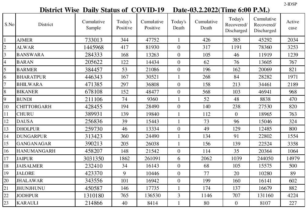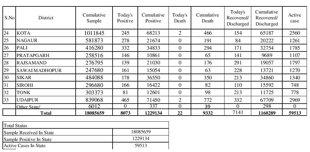 स्वास्थ्य विभाग से प्राप्त आंकड़ों के अनुसार पिछले 24 घंटो में जयपुर में 1862, जोधपुर में 765 अलवर में 417, भीलवाड़ा में 297, नागौर में 278, कोटा में 245, अजमेर में 344 संक्रमित मिले। राज्य में एक्टिव 59513 रही जबकि आज 7141 लोग रिकवर हुए।