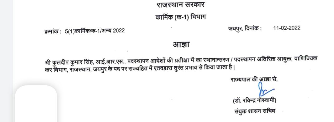 इसी तरह कार्मिक ने एक और आदेश जारी कर आईआरएस कुलदीप कुमार सिंह को अतिरिक्त आयुक्त वाणिज्य कर विभाग के पद पर लगाया गया हैं।