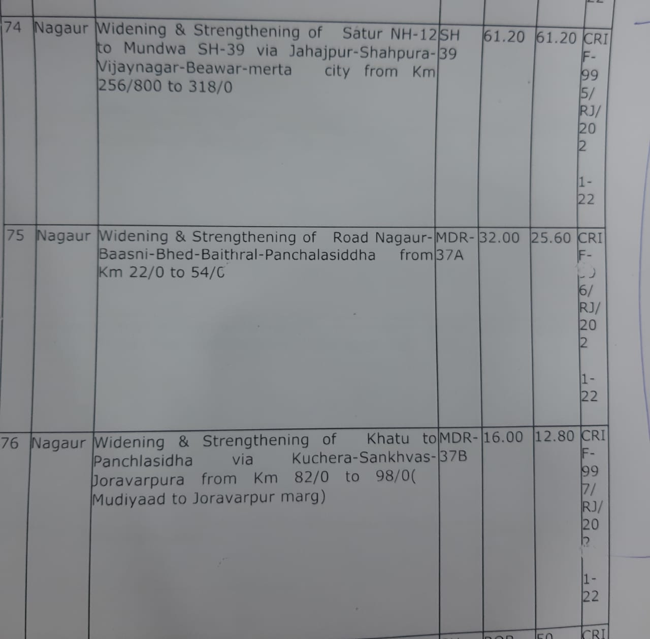 2-चातरा-माँझरा से ढिंगसरा,भेड़,बैराथल होते हुए पांचला सिद्धा तक एमडीआर 37 ए श्रेणी की 32 किलोमीटर सड़क के लिए 25.60 करोड़ रुपये