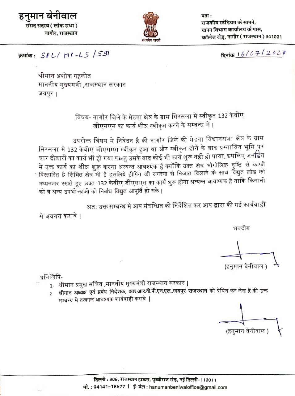 सिरसला में शीघ्र शुरू हो 132 केवीए जीएसएस का कार्य – सांसद ने शुक्रवार को राज्य के मुख्यमंत्री अशोक गहलोत व राजस्थान विद्युत प्रसारण निगम लिमिटेड के अध्यक्ष व प्रबंध निदेशक को पत्र लिख मेड़ता विधानसभा के ग्राम सिरसला में स्वीकृत 132 केवीए जीएसएस का कार्य जल्द से जल्द शुरू करने की मांग की। सांसद ने कहा,उक्त स्वीकृत जीएसएस की चार दिवारी का कार्य हो गया परन्तु उसके बाद कार्य बंद हो गया,बेनीवाल ने कहा कि इसका कार्य हो जाने से आस पास के कई गांवों में निर्बाध विद्युत आपूर्ति मिल सकेगी ।