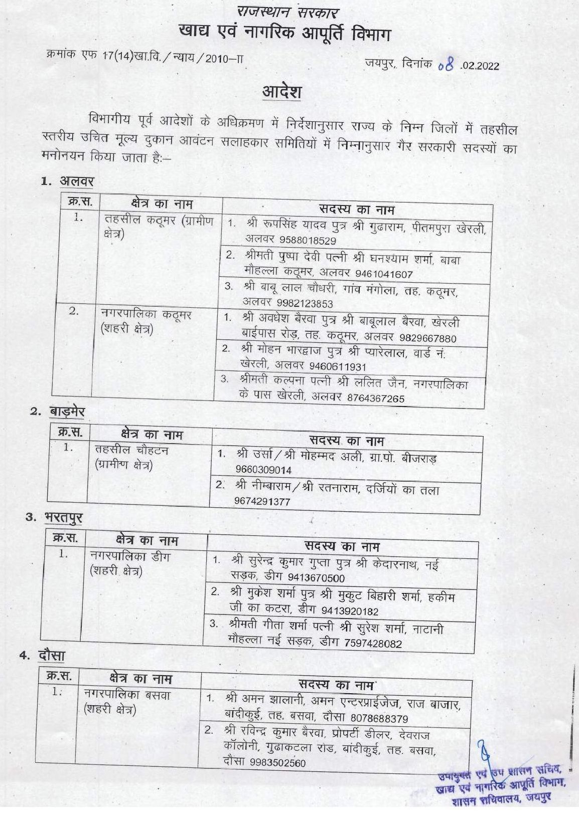 जयपुर। गहलोत सरकार ने खाद्य एवं नागरिक आपूर्ति विभाग में तहसील स्तर पर उचित मूल्य की दुकान आवंटन के लिए सलाहकार समितियों का गठन कर उनमें स्थानीय कांग्रेसियों को गैर राजनीतिक सदस्य बना उन्हें खुश किया है। 14 जिलों में किए गए मनोनीत सदस्यों की सूची इस प्रकार है। पहले भी इस तरह की नियुक्ति कुछ जिलों में की गई थी। कुछ स्थानों पर गैर कांग्रेसजनों की नियुक्ति हो जाने से विवाद भी उठा था।